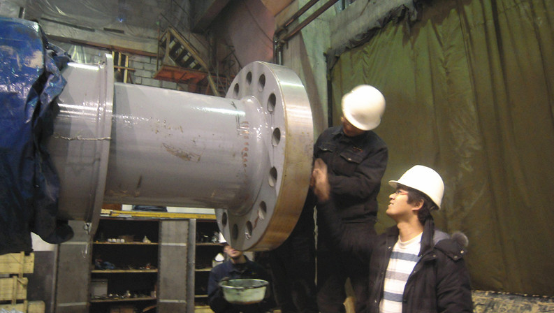 圖為技術(shù)人員對發(fā)電機軸進(jìn)行吊裝前的準備
