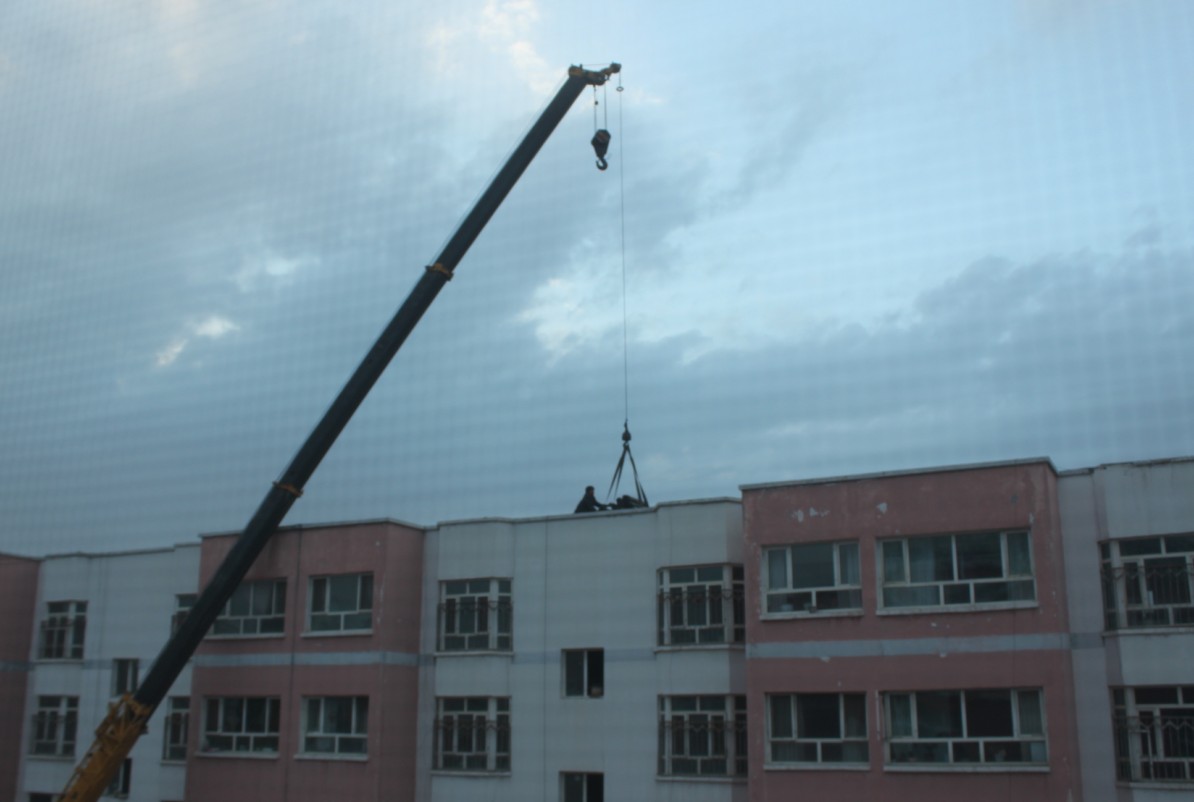 圖為吊車(chē)正在往樓頂上轉運鋪設屋面的施工材料