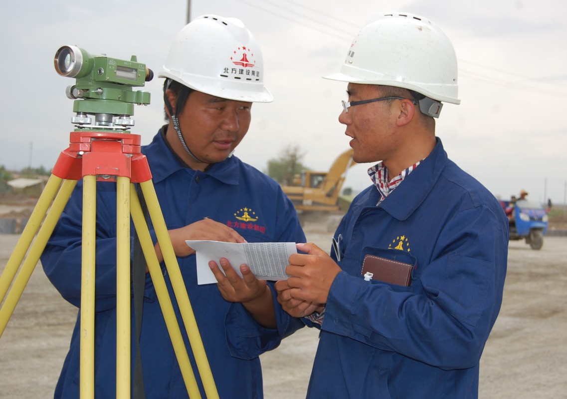 圖為青年突擊隊員在施工現場(chǎng)討論施工技術(shù)方案