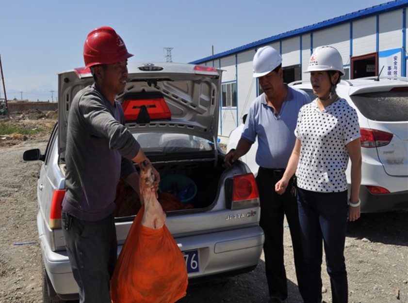 圖為集團工會(huì )主席李桂萍和廣達勞務(wù)公司經(jīng)理楊軍民在為項目部的勞務(wù)工發(fā)放慰問(wèn)品