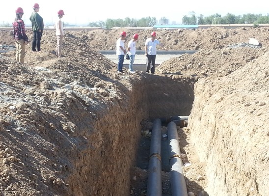 圖為績(jì)效考核組在天北新區民兵訓練基地換熱站施工現場(chǎng)