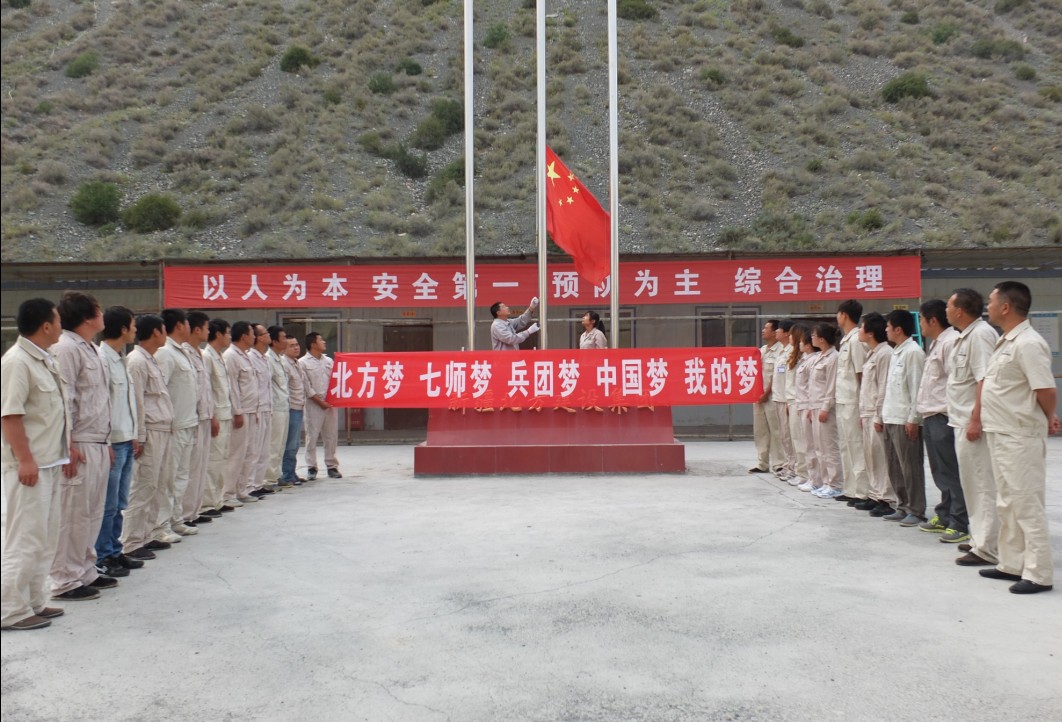 (王清軍)75日清晨,集團直屬項目三部黨支部在奎屯河施工現場(chǎng)開(kāi)展“我的北方夢(mèng)、七師夢(mèng)、兵團夢(mèng)、中國夢(mèng)”主題升旗儀式。利用升國旗儀式向項目部做活動(dòng)動(dòng)員,讓項目部員工了解“我的中國夢(mèng)”主題教育活動(dòng)內容及活動(dòng)安排,宣傳“中國夢(mèng)”提出的背景及內涵等,激發(fā)愛(ài)國主義熱情,并針對現今維穩形勢,要求大家立足自己的工作崗位,管好施工現場(chǎng),為維穩工作做出自己的貢獻。