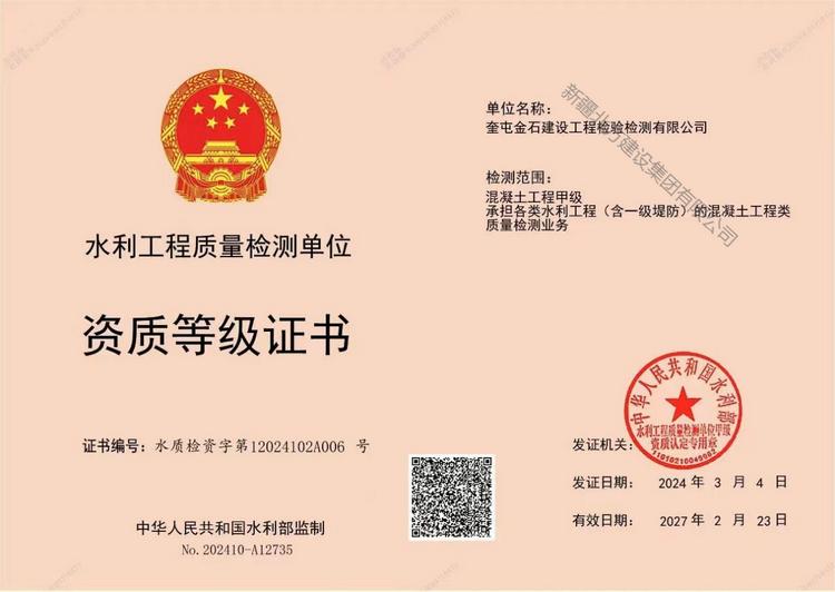 喜訊!金石檢測公司順利晉級水利工程混凝土甲級資質(zhì)